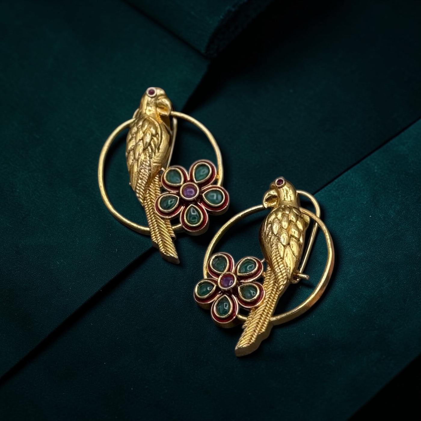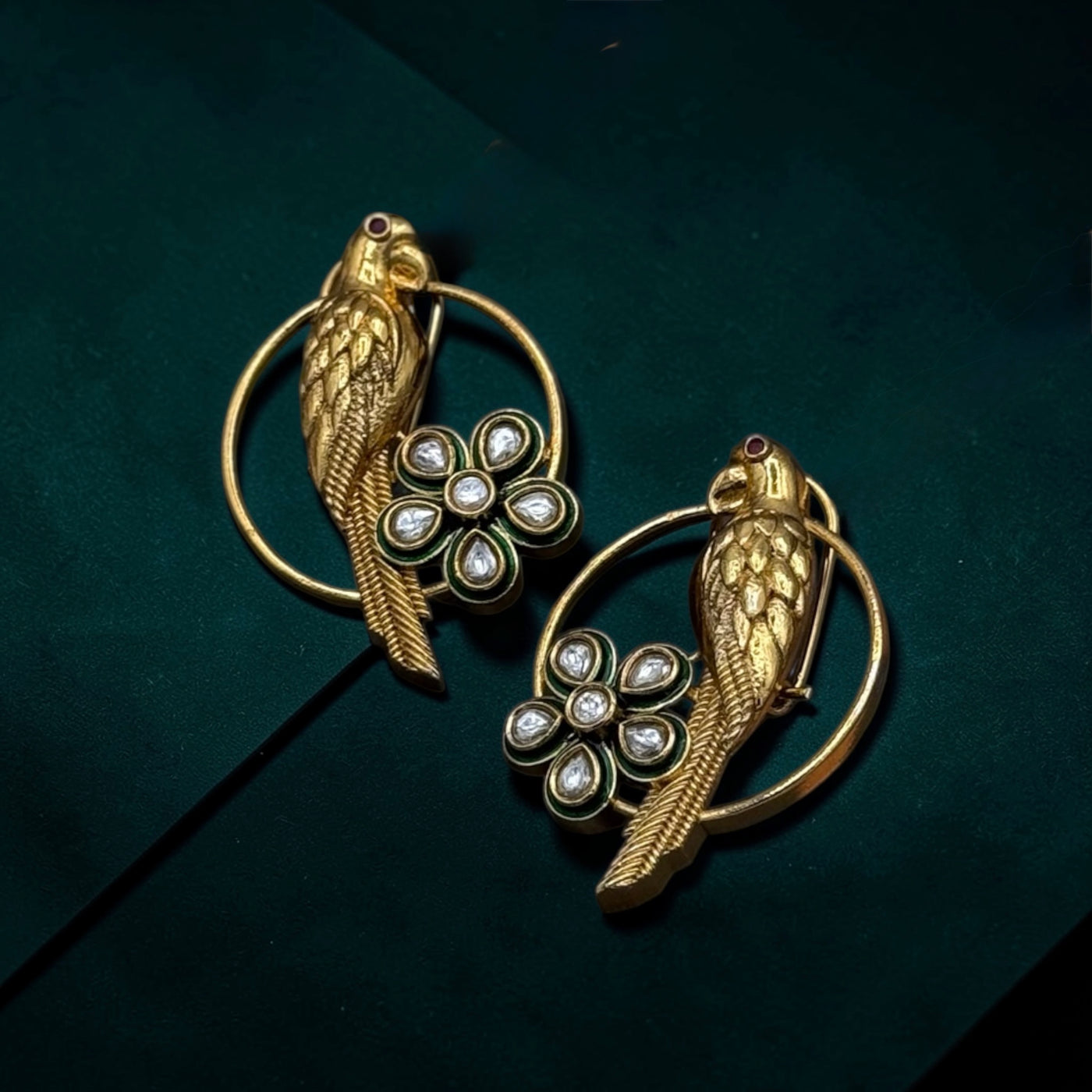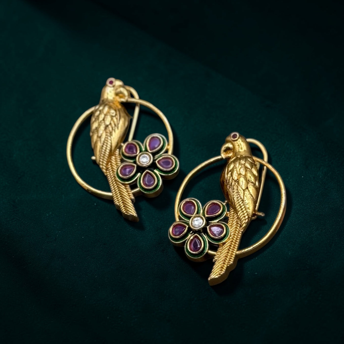 Classic hoop silhouette, accented with a good parrot, delicate polki-style floral detailing and subtle enamel highlights.
