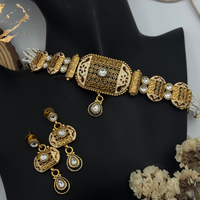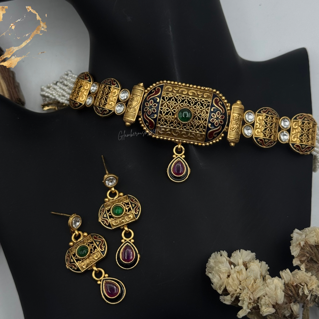 Introducing our Jharoka Choker Set, a stunning piece that echoes the grandeur and elegance of tradition. This exquisite choker features a rich, dark polish that beautifully complements the intricate Meena work. Each element of this choker is meticulously crafted, showcasing an array of delicate patterns and rich colors that reflect the timeless artistry of our skilled craftsmen.